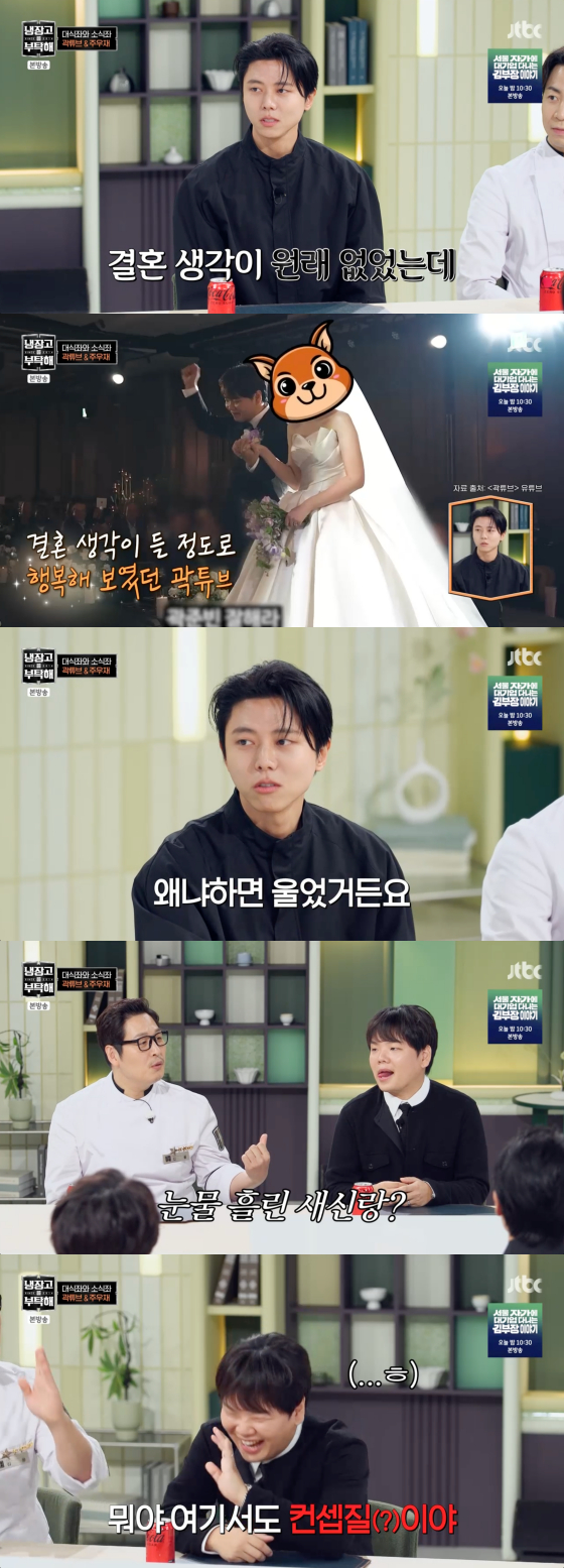 앞서 곽튜브는 지난 10월 11일 서울 여의도의 한 호텔에서 5세 연하의 공무원과 결혼식을 올렸다. 곽튜브 아내는 현재 2세를 임신 중이다.곽튜브는 결혼식 날 혼인서약서를 읽다가 눈물을 흘렸다고. 주우재는 당시 곽튜브를 흉내내 웃음을 자아냈다.