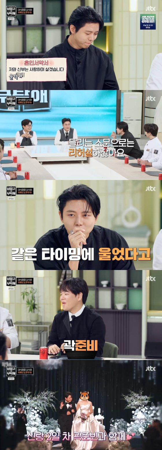 주우재는 그러면서 "들리는 소문으로는, 곽튜브가 리허설 때 (혼인서약서의) 같은 타이밍에서 울었다고 하더라"고 폭로했다.이에 곽튜브는 당황하면서도 "맞다. 본식 가니까 그 부분이 또 슬프더라. 그래서 눈물이 난 것"이라고 해명했다.