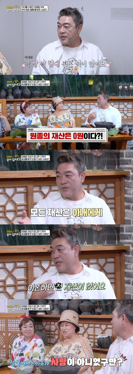 배우 이원종이 아내에게 모든 재산을 넘겼다.지난 3일 방송된 KBS 2TV 예능 프로그램 '박원숙의 같이 삽시다'에는 이원종이 게스트로 출연했다.