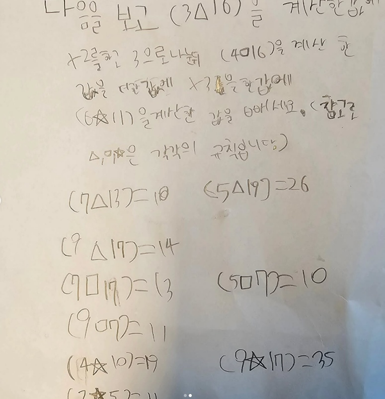 이지현은 최근에도 "자기가 만든 문제라며 신나서 엄마보고 풀어보래요. 아이의 기대에 부응해주고 싶지만 눈만 문제를 읽게 되네요"라며 아들이 자체적으로 만든 수학문제를 공개했다.