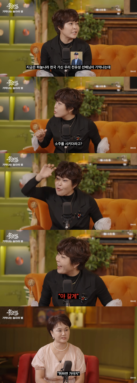 그는 "일산 MBC에서 '세바퀴'를 녹화할 때인데 게스트로 나온 전유성 선배가 '가기 전에 술 한 잔 마실까' 하시더라. 바로 맞은편에 있는 중국집에 갔다. 그런데 오빠(전유성)가 앉자마자 소주를 시켰다"고 말했다.이어 "글라스에 소주 반 병 정도가 들어가더라. 그렇게 8분 만에 소주 세 병을 비우시더니 '나 갈게'라고 하시더라. 단무지밖에 안 나온 상황이었다"고 털어놓으며 헛웃음을 터뜨렸다.
