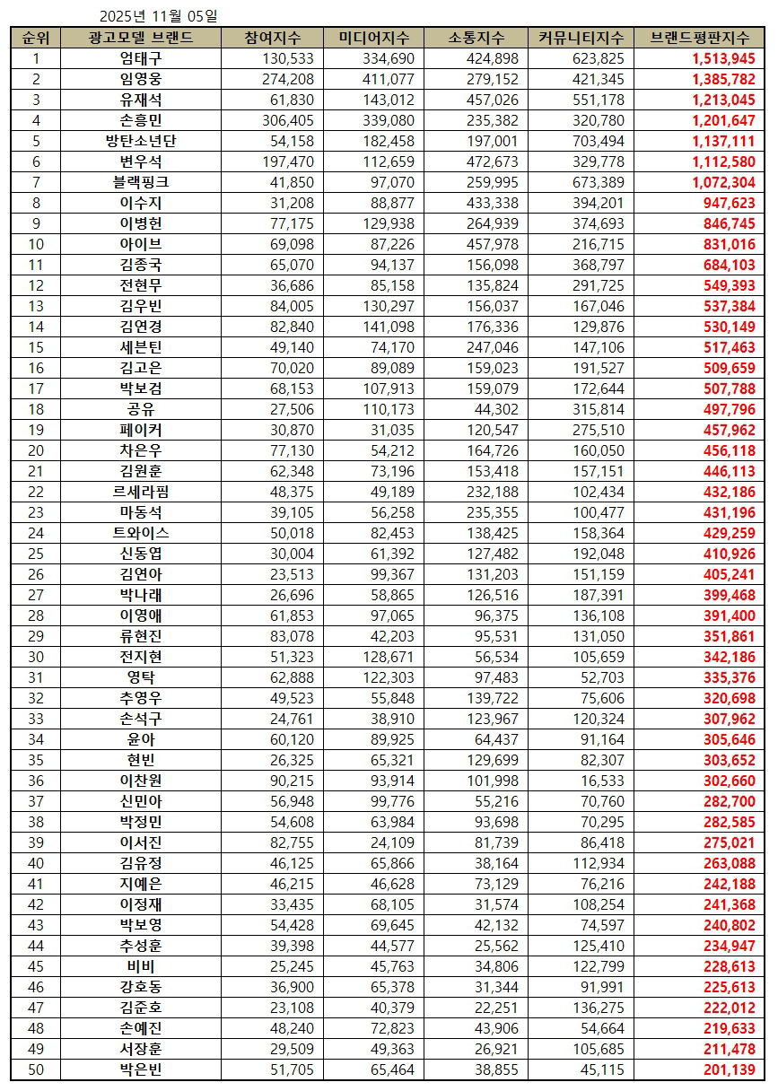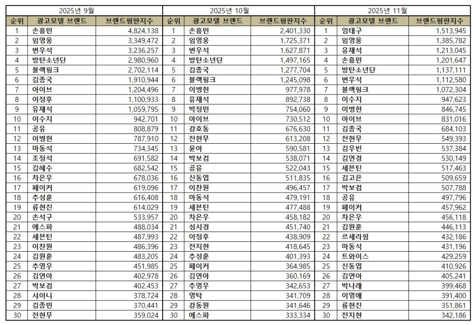 2025년 11월 광고모델 브랜드평판 30위 순위는 엄태구, 임영웅, 유재석, 손흥민, 방탄소년단, 변우석, 블랙핑크, 이수지, 이병헌, 아이브, 김종국, 전현무, 김우빈, 김연경, 세븐틴, 김고은, 박보검, 공유, 페이커, 차은우, 김원훈, 르세라핌, 마동석, 트와이스, 신동엽, 김연아, 박나래, 이영애, 류현진, 전지현 순으로 분석됐다.