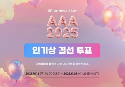 '10주년 아시아 아티스트 어워즈 2025'(10th Asia Artist Awards 2025, 이하 '10주년 AAA 2025')의 인기상 결선 투표는 지난 10월 16일부터 11월 5일 자정까지 진행 중이다. 엠비씨플러스(MBC PLUS)와 모바일 광고 플랫폼 기업 티앤케이팩토리(TNK Factory)가 공동 사업 중인 모바일 아이돌 팬덤 어플리케이션 '아이돌챔프'에서 해당 투표가 이뤄지고 있다.
