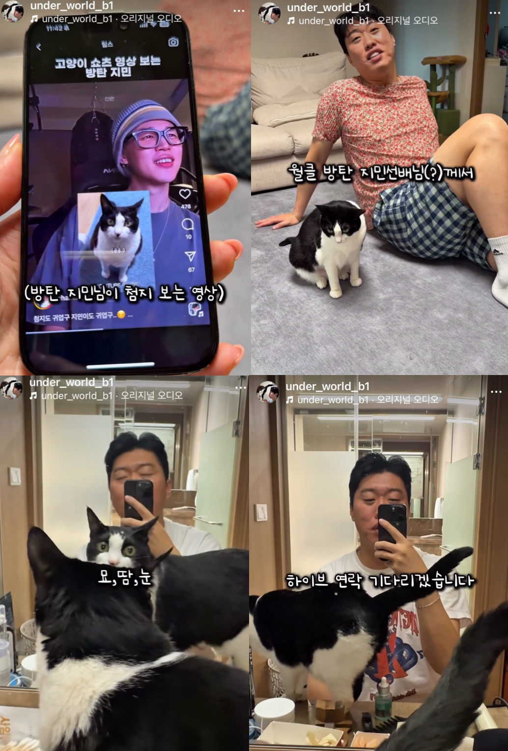지민이 "합격"이라는 댓글을 직접 남기면서, 월드스타와 고양이 유튜버의 유쾌한 '티키타카' 피드백 루프가 완성되었고, 이후 '언더월드' 채널에는 '이달의 영업왕' 콘텐츠가 공개됐다.