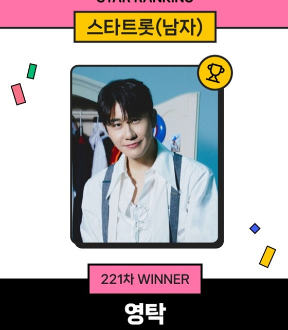 가수 영탁이 스타랭킹 스타트롯 남자 투표 1위 자리를 탈환했다. 영탁은 지난 10월 30일 오후 3시 1분부터 11월 6일 오후 3시까지 진행된 221차 스타랭킹 스타트롯 남자 랭킹 투표에서 31만 4168표를 받아 1위에 올랐다.