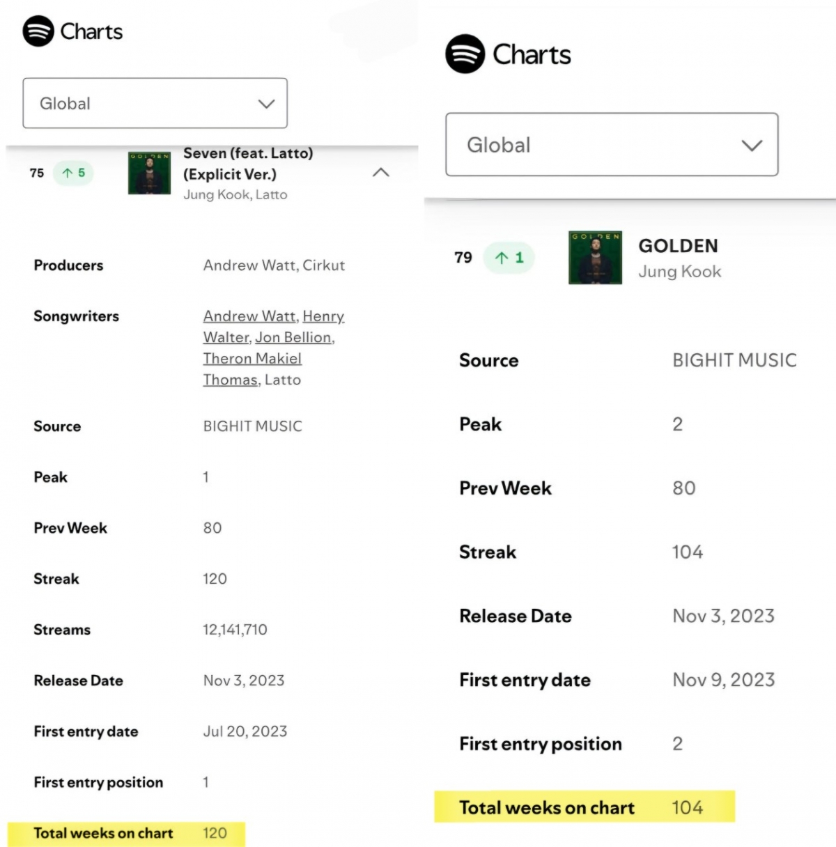 정국이 2023년 11월 발매한 첫 솔로 앨범 'GOLDEN'(골든)도 10월 24일~30일 자 스포티파이 '위클리 톱 앨범 글로벌' 차트에 79위로 중위권에 안착하며 롱런 음반 파워를 자랑했다.