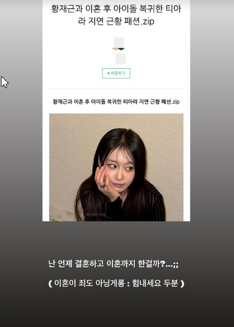패션 디자이너 황재근이 걸 그룹 티아라 멤버 지연과 엉뚱한 이혼설에 휘말려 당황한 반응을 보였다. 황재근은 7일 자신의 인스타그램을 통해 한 장의 사진을 올렸다. 사진은 '황재근과 이혼 후 아이돌 복귀한 티아라 지연 근황 패션.zip'라는 제목의 블로그 글을 캡처한 것으로, 황재근이 마치 지연의 전 남편인 것처럼 오해를 불러일으킨다.