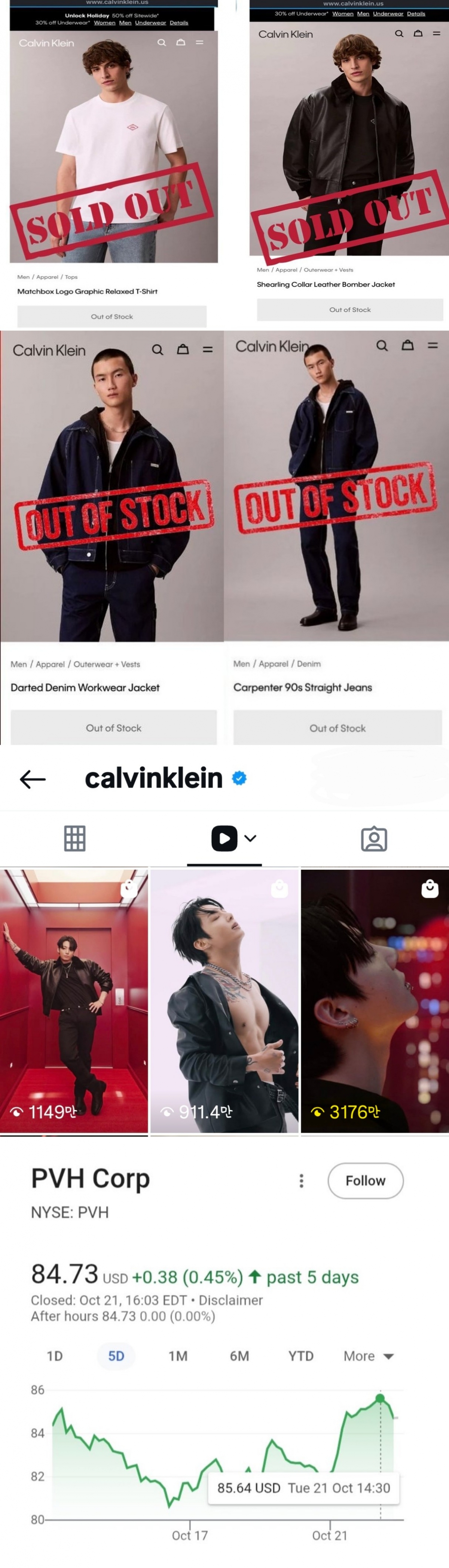 지난 10월 21일 정국의 새로운 티저 영상 공개 후 일주일 하락 중이던 캘빈클라인 PVH 주가가 처음으로 상승세를 나타냈고 해당 월을 통틀어 두 번째로 높은 최고치를 기록하기도 했다.
