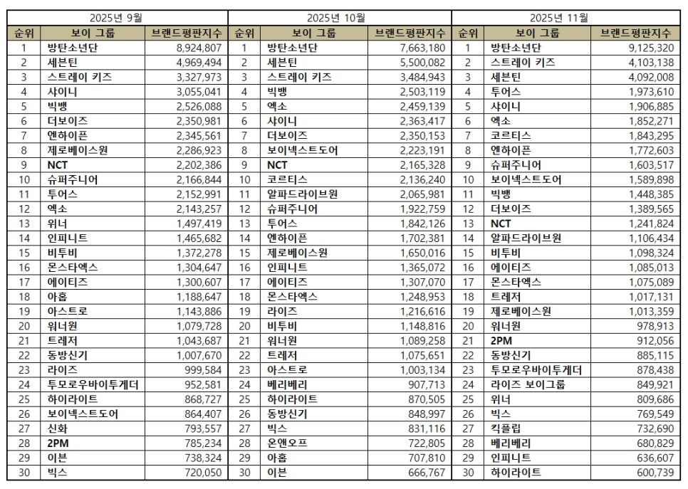 2025년 11월 보이그룹 브랜드평판 30위 순위는 방탄소년단, 스트레이 키즈, 세븐틴, 투어스, 샤이니, 엑소, 코르티스, 엔하이픈, 슈퍼주니어, 보이넥스트도어, 빅뱅, 더보이즈, NCT, 알파드라이브원, 비투비, 에이티즈, 몬스타엑스, 트레저, 제로베이스원, 워너원, 2PM, 동방신기, 투모로우바이투게더, 라이즈 보이그룹, 위너, 빅스, 킥플립, 베리베리, 인피니트, 하이라이트 순으로 분석됐다.