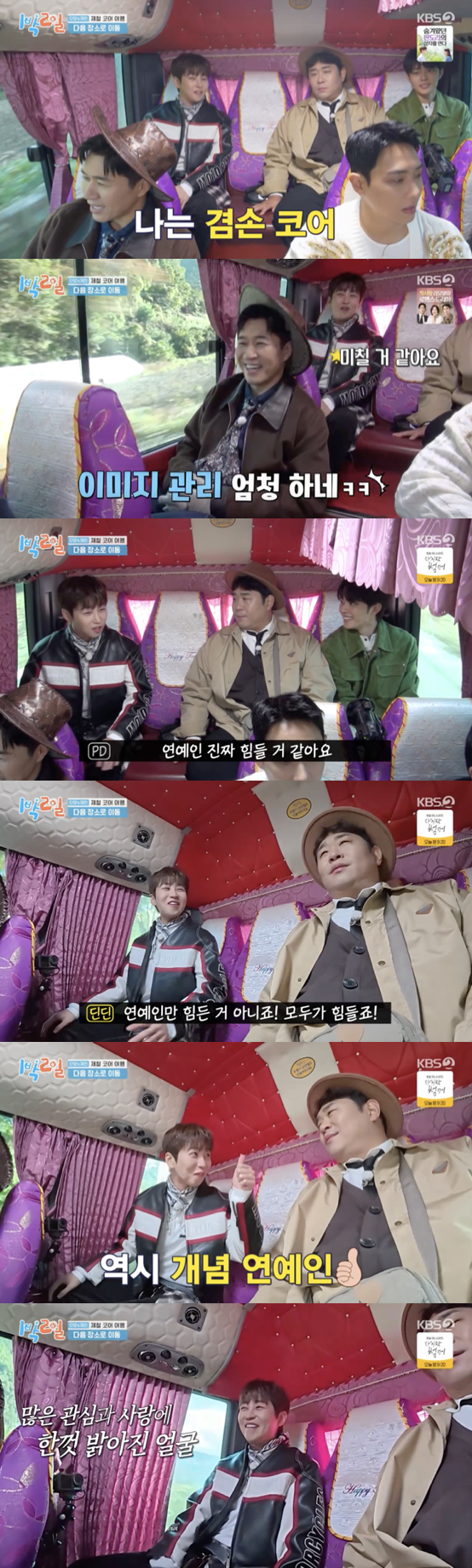 그는 "얼마 전에 미국 스케줄 다녀온 뒤 너무 피곤했는데 PD님이 '너무 힘드시겠어요, 연예인들 진짜 힘들 거 같아요'라고 하더라. 근데 이게 변화구 같았다"며 웃음을 지었다. 이어 그때 나락 감지 센서가 발동했다며 "잘못 대답하면 끝장이라 '연예인만 힘든 게 아니죠! 모두가 힘들죠!'라고 했다. 그랬더니 '역시 개념 연예인'이라는 말을 들었다"고 덧붙였다.유선호가 "형 요즘 얼굴 밝아졌다"라고 하자, 딘딘은 "사랑받으니까 그렇다. 나 오랜만에 사랑받는다"고 답했다.
