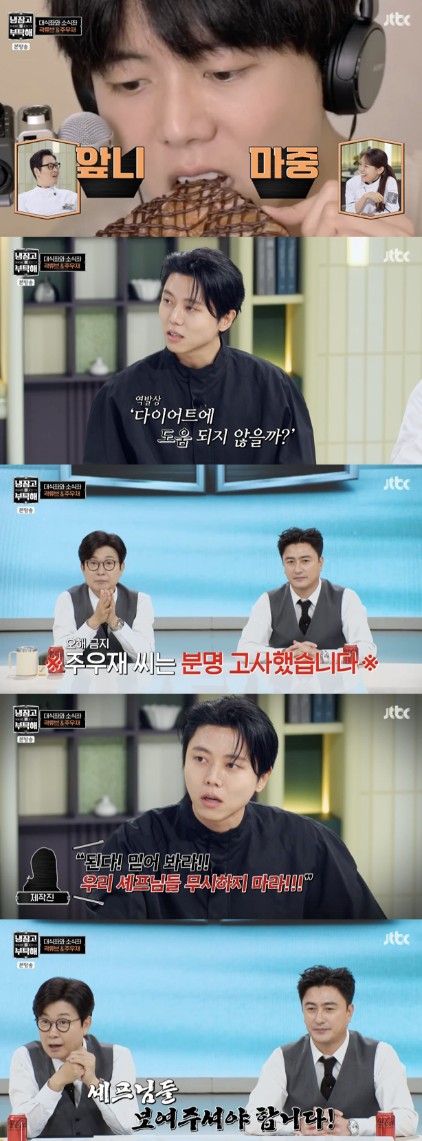 그는 해당 콘텐츠를 기획하게 된 계기에 대해 "채널을 운영하다 보니 먹는 장면이 나왔는데 '그렇게 먹을 거면 버려라'라는 댓글이 달렸다. 그걸 보고 '다이어트에 도움되지 않을까?' 싶어서 다이어트 먹방처럼 만들어봤다"고 설명했다.그러자 MC 김성주는 "그런 주우재 씨가 사실 '냉부해' 섭외를 한 번 고사했었다"고 폭로해 현장을 웃음바다로 만들었다. 이에 주우재는 "작가님이 '냉장고에 재료가 없어도 된다, 셰프님을 믿으라'고 하셔서 결국 출연하게 됐다"고 답하며 쿨하게 인정했다.