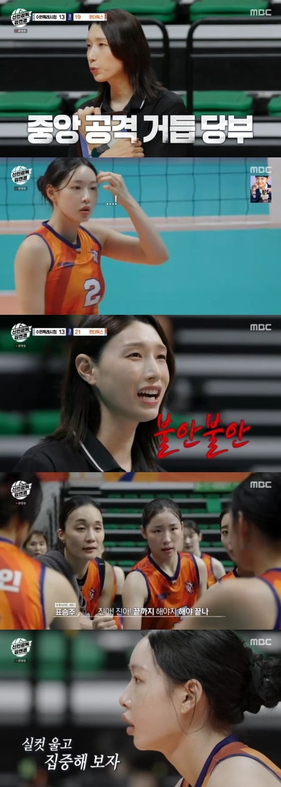 '필승 원더독스'의 이진 선수가 김연경의 불호령에 결국 눈물을 흘렸다. 9일 방송된 MBC 예능 프로그램 '신인감독 김연경'에는 '필승 원더독스'가 실업 배구 최강팀 수원특례시청 배구단과 맞대결을 펼치는 모습이 그려졌다.