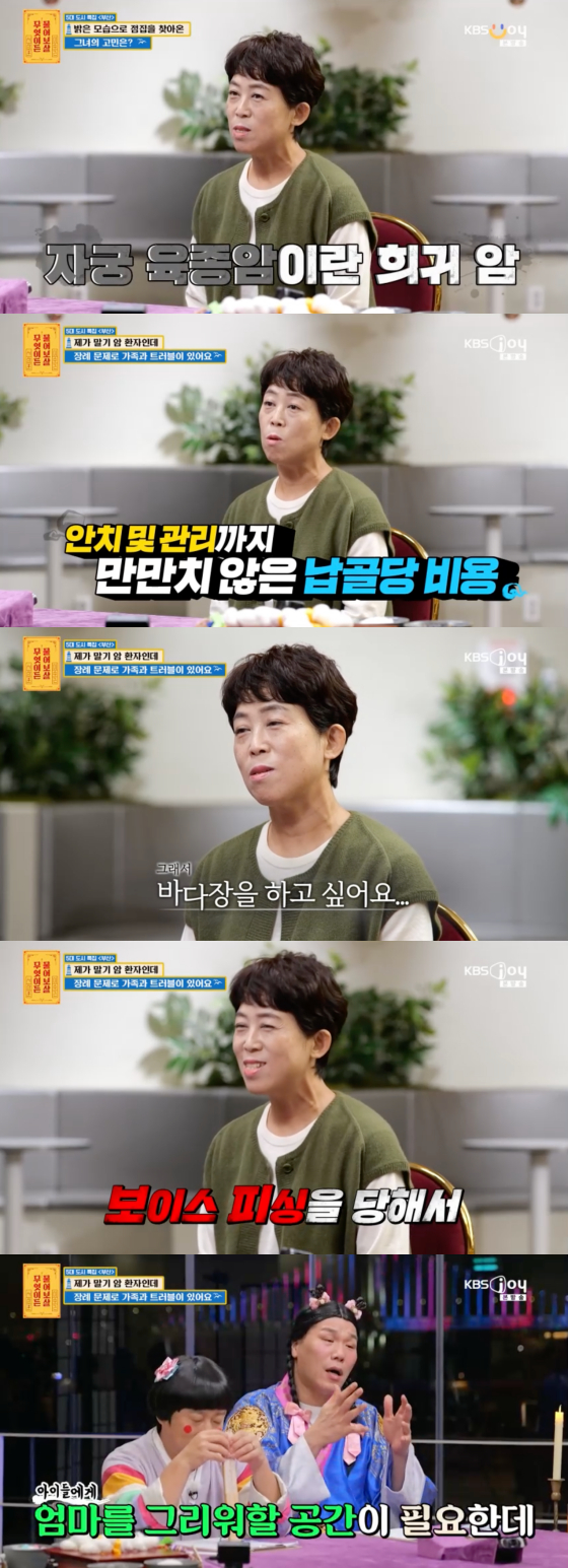 이날 사연자는 "제가 말기 암 환자인데 가족들과 장례 문제로 문제를 겪고 있다"며 "2021년도에 처음 암을 발견했을 때는 1기였다. 자궁 육종암 1기의 경우 재발 비율이 50% 이상이다. 지난해 9월에 암이 또 재발했다"고 밝혔다.