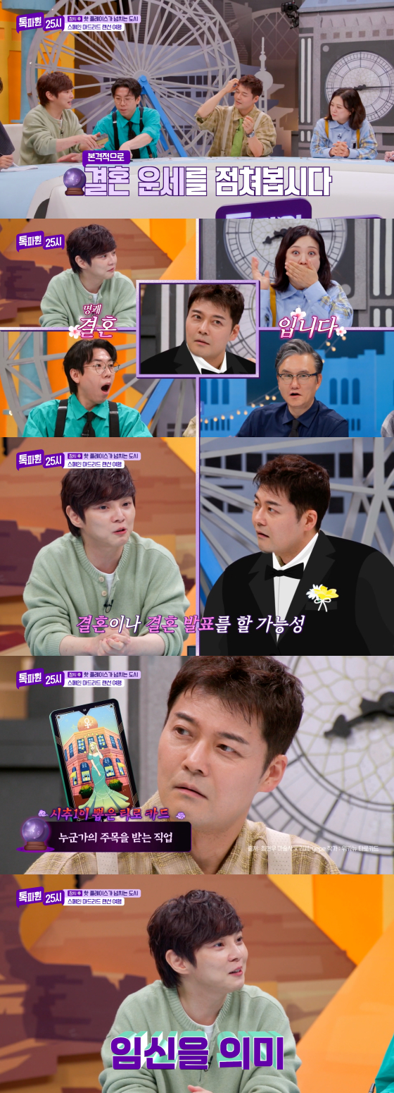 방송인 전현무가 갑작스러운 결혼·임신운에 당황했다.지난 10일 방송된 JTBC 예능 프로그램 '톡파원 25시'에서는 마술사 최현우가 전현무의 점괘를 보는 모습이 그려졌다.