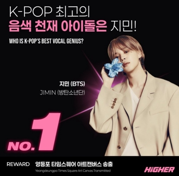 방탄소년단(BTS) 지민이 독보적인 음색으로 또 한 번 K팝 최고의 보컬리스트임을 입증했다.지민은 최근 글로벌 아이돌 인기투표 플랫폼 '하이어(HIGHER)'에서 진행된 'K-POP 최고의 음색 천재 아이돌은?' 설문에서 압도적인 득표율로 1위를 차지했다.
