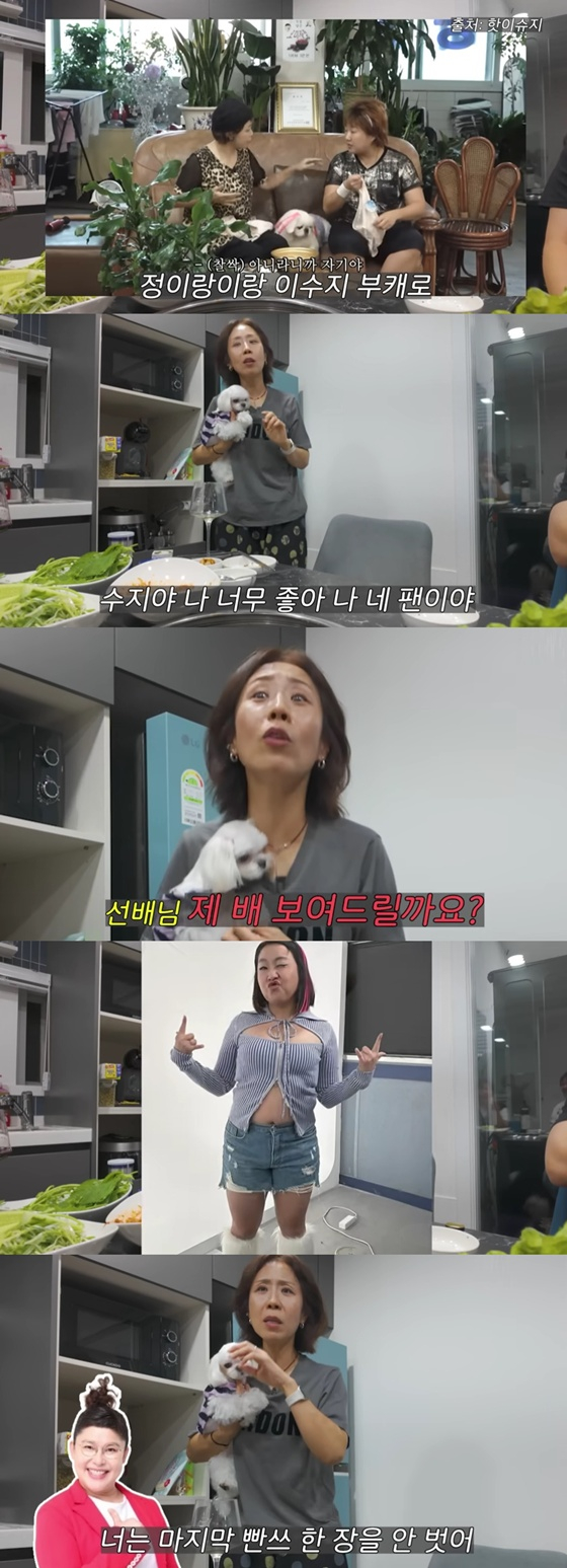 이어 "누구 통해서 이수지한테 전화로 '수지 나 너 너무 좋아, 네 팬이야'라고 했더니 '선배님 내 배 보여드릴까요' 하더라. 갑자기"라며 상의를 위로 올리는 듯한 제스처를 보였다. 그러면서 "진짜 멋있어"라고 이수지의 열정을 칭찬했다.