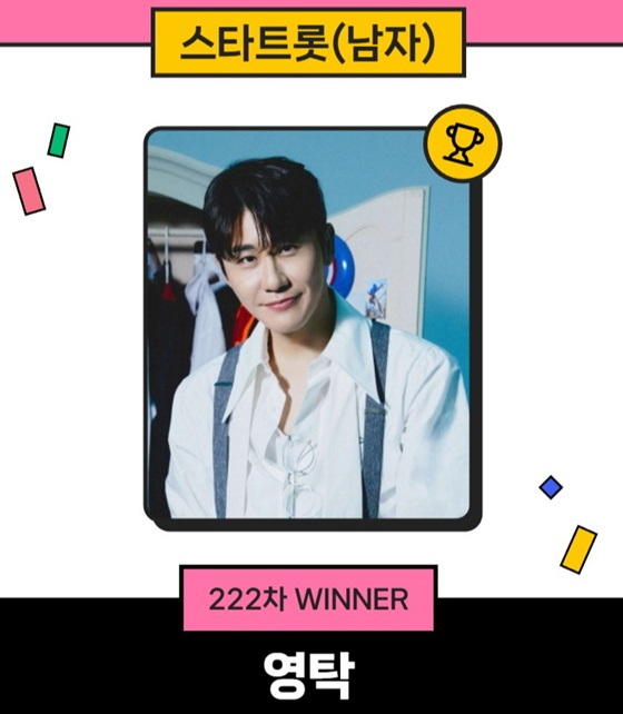 가수 영탁이 스타랭킹 스타트롯 남자 투표 1위 자리를 지켜냈다. 영탁은 지난 6일 오후 3시 1분부터 13일 오후 3시까지 진행된 222차 스타랭킹 스타트롯 남자 랭킹 투표에서 25만 2917표를 받아 1위에 등극했다.