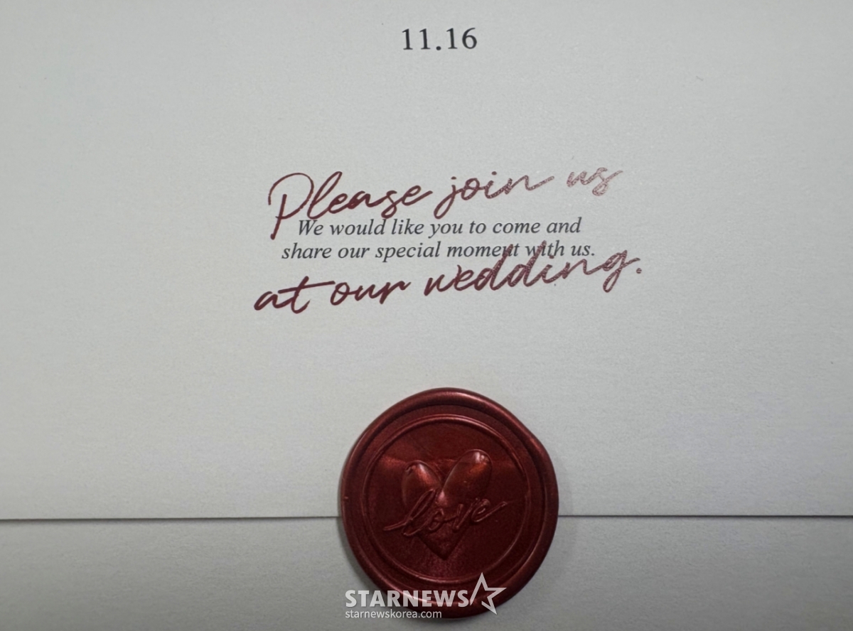 청첩장의 다른 면에는 'Please join us, at our wedding. We would like you to come and share our special moment with us'(우리 결혼식에 함께해 주세요. 와서 우리와 특별한 순간을 함게 나눴으면 합니다)라는 영어로 쓴 초대 글이 실려 있다.