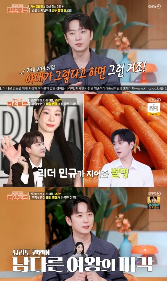 그런가 하면 고우림은 10년 만에 가수 복귀 무대를 앞둔 이정현이 남편과 말다툼하는 모습을 보면서 "아내가 그렇다고 하면 맞는 거다"라고 이정현 편을 들어 웃음을 자아냈다.