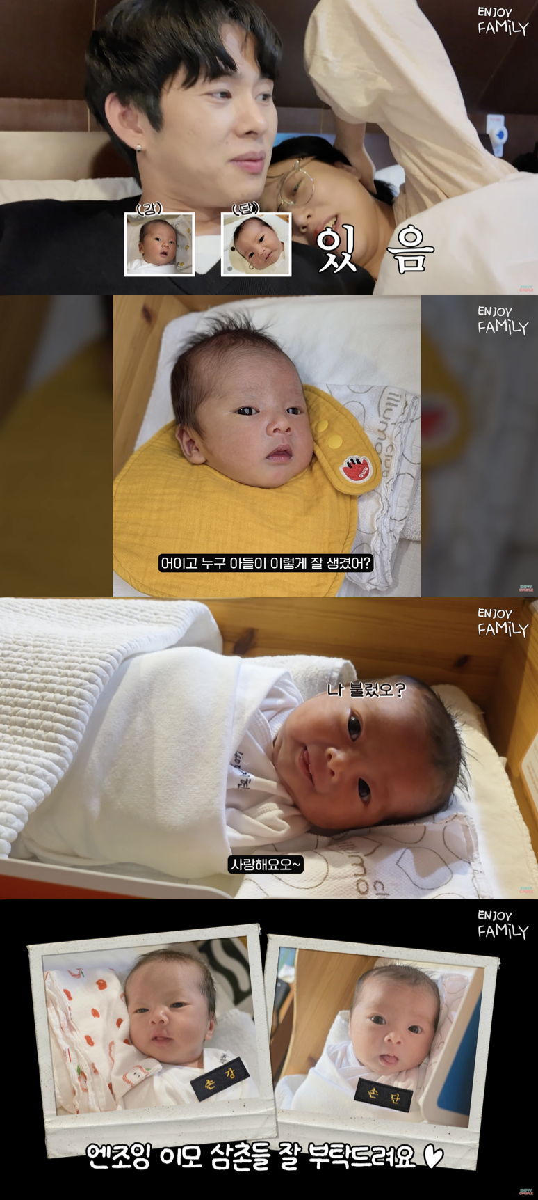개그맨 커플 임라라·손민수가 쌍둥이 남매의 이름을 공개했다.16일 유튜브 채널 '엔조이커플'에는 "[EN]드디어 쌍둥이들 이름 공개. 멘탈 탈탈 털린 쌍둥이 소아과 진료 첫 외출까지!!"라는 제목의 영상이 업로드됐다. 해당 영상에서 임라라·손민수 부부는 처음으로 쌍둥이 남매의 실명을 공개했다.