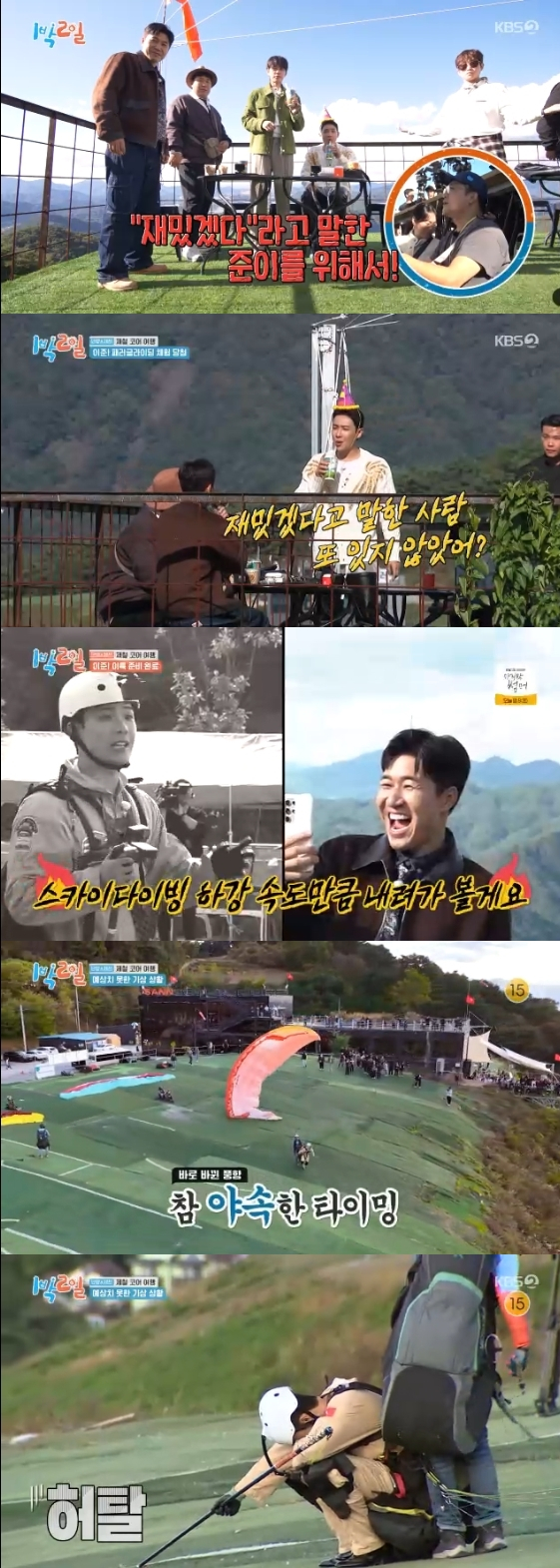 이때 이준을 응원하기 위해 도착한 멤버들은 "준이 형이 엄청 위로 올라가 보고 싶다고 하더라", "스카이다이빙은 했는데 패러글라이딩은 무시하더라" 등의 조롱을 이어갔다. 지난해 하계 MT 특집에서 스카이다이빙으로 벌칙을 수행했던 이준은 당시의 악몽을 떠올린 듯 긴장감을 감추지 못했다. 그의 이륙을 지켜보기 위해 수많은 시민이 응원의 목소리를 보탰지만, 이준의 도전은 좀처럼 쉽지 않았다.