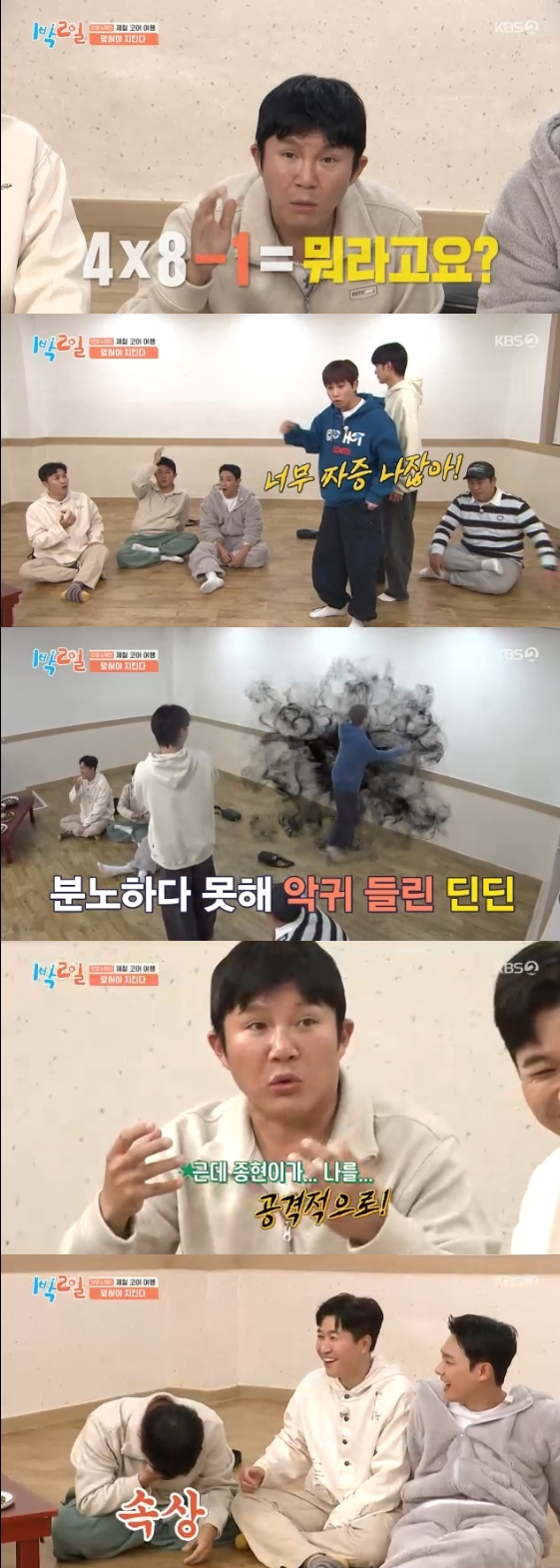 그러나 조세호가 또다시 정답을 맞히지 못하자 멤버들의 비난이 쇄도했다. 특히 딘딘은 "진짜 짜증 난다. 안 들린 척 뭐냐. 너무 짜증 나!"라며 참아왔던 분노를 표출했다. 딘딘이 화가 풀리지 않는 듯 벽을 내리치며 울분을 토하자 김종민은 "지금 안에 있는 게 다 터졌다"라고 놀라워했다.