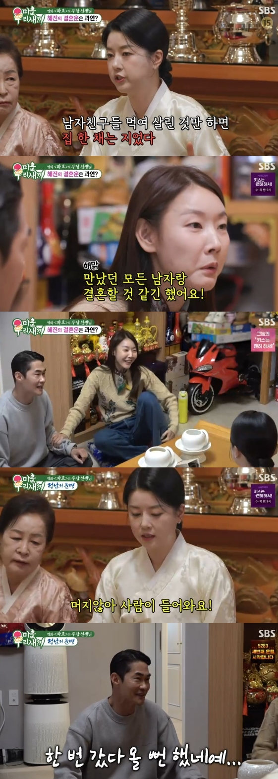 이에 한혜진은 "어린 시절에 만났던 남자친구는 애처롭고 불쌍하고 가여운 마음으로 만났던 것 같다"라고 고백했다. 그러자 무속인은 "할머니가 내후년까지는 마지막 성혼이 들어와 있다고 하신다. 연하가 인연으로 있다"라고 말했고, 한혜진은 "어딨어요? 올해 들은 말 중에 가장 행복한 말이다"라며 환호했다.