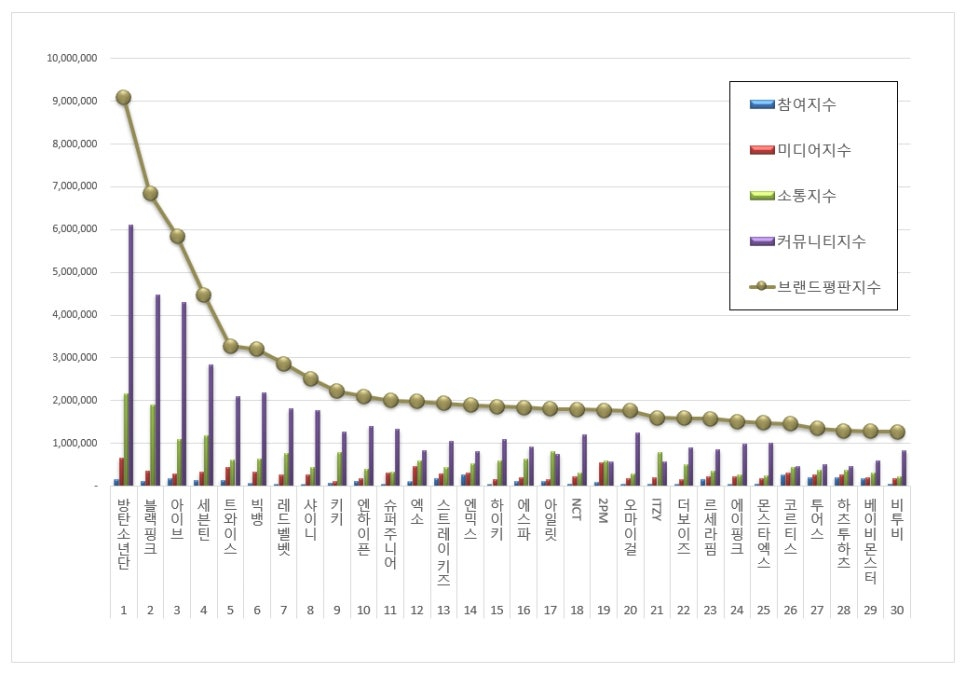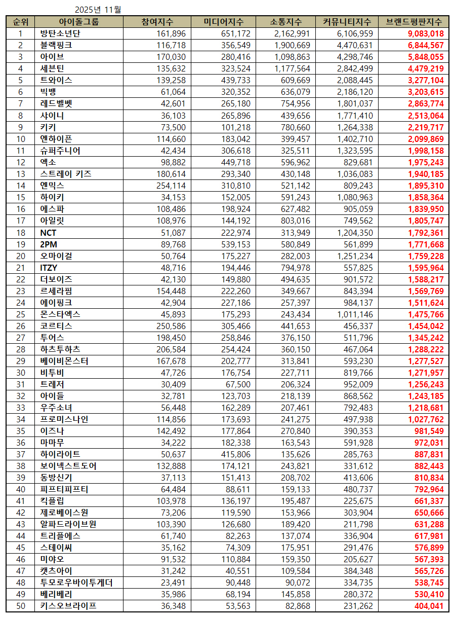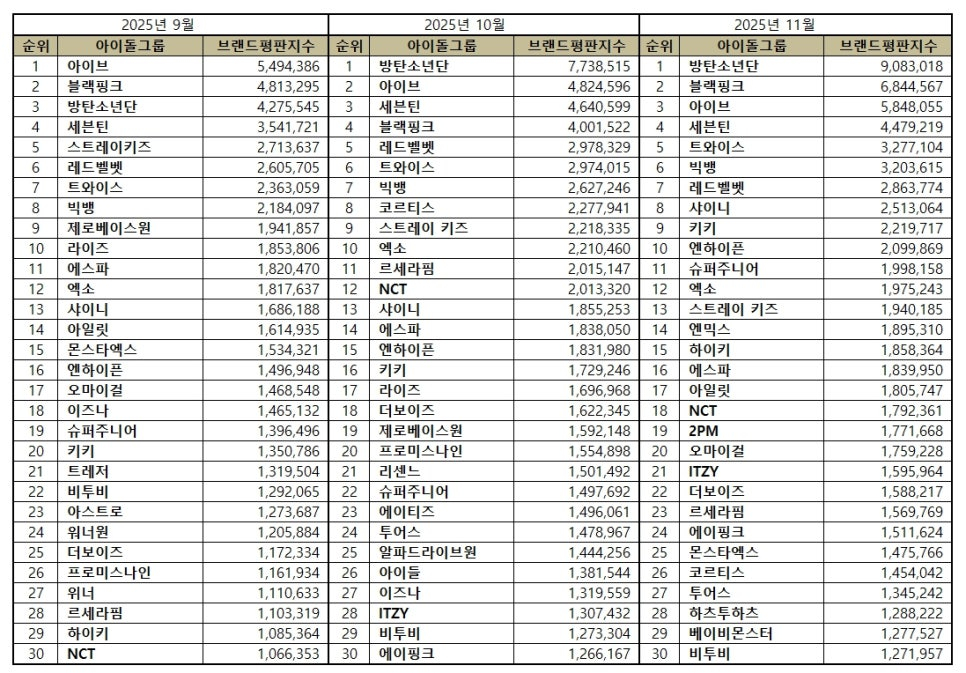 2025년 11월 아이돌그룹 브랜드평판 30위 순위는 방탄소년단, 블랙핑크, 아이브, 세븐틴, 트와이스, 빅뱅, 레드벨벳, 샤이니, 키키, 엔하이픈, 슈퍼주니어, 엑소, 스트레이 키즈, 엔믹스, 하이키, 에스파, 아일릿, NCT, 2PM, 오마이걸, ITZY, 더보이즈, 르세라핌, 에이핑크, 몬스타엑스, 코르티스, 투어스, 하츠투하츠, 베이비몬스터, 비투비 순으로 분석됐다.