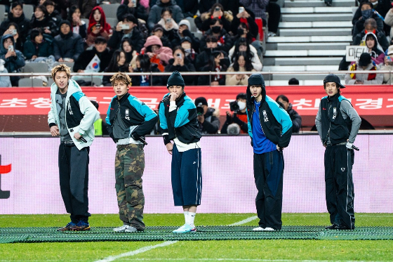 코르티스는 압도적인 퍼포먼스를 펼치며 강렬한 눈도장을 찍었다. 특히 이날은 국가대표팀의 올해 마지막 A매치라 많은 관심이 쏠렸다. 다섯 멤버는 국가대표 선수단이 실제 착용하는 앤썸 재킷을 리폼한 의상을 입고 등장해 시작부터 눈길을 사로잡았다.