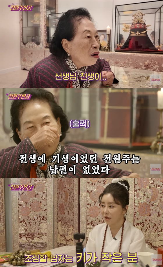 이어 "선생님을 흔히 '짠순이'라고 하는데 전생의 기운이 온 것이다. 절약해야 한다는 게 강했던 거다"라며 "전생에 기생이었기에 남편이 없었다. 혼자였던 것"이라고 덧붙였다. 그러자 전원주는 "남자가 있어야 한다. 버스를 타도 여자 옆에 안 앉는다. 내가 남자를 좋아한다. 외롭다"고 했다.