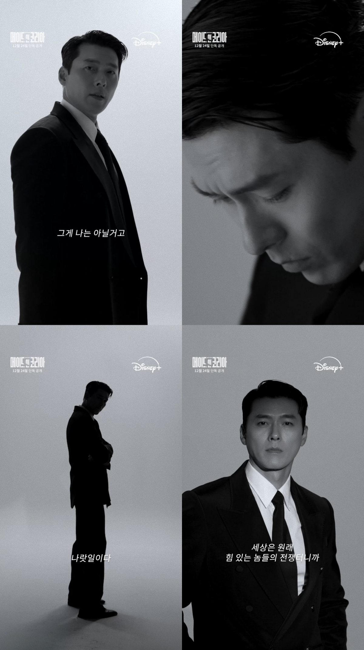함께 공개된 캐릭터 티징 영상은 흑백 톤의 화면 속 현빈의 옆모습 실루엣으로 시작해 단숨에 눈길을 끈다. "이 판은 누구 하나 죽어야 하는 싸움이야. 그게 나는 아닐 거고"라는 대사를 읊는 현빈의 나레이션이 더해지며 긴장감이 빠르게 고조되는 가운데, 날카로운 컷 전환과 긴박감 넘치는 음악이 어우러져 몰입도를 한층 끌어올린다. 카메라를 응시하는 현빈의 냉정한 눈빛과 여유로운 제스처와 표정은 '백기태'의 냉혹하면서도 흔들림 없는 캐릭터를 압축적으로 보여주며, 그가 과연 어떤 방식으로 이 권력 게임을 이끌어갈지 궁금증을 자아낸다. 이어, "나보다 더 큰 힘을 가진 자들을 끌어내리고 끝내, 세상을 바꿀 것이다. 세상은 원래 힘 있는 놈들의 전쟁터니까. 누군가의 죽음이 나에게는 기회가 되는 그런 전쟁터"라는 대사는 힘이 곧 정의가 되던 시대, 누구보다 큰 힘을 가지기 위해 끝없이 치닫는 '백기태'의 확고한 가치관을 암시하며 묵직한 여운을 남긴다. 한편 '메이드 인 코리아'는 오직 디즈니+를 통해 12월 24일 2개, 12월 31일 2개, 1월 7일 1개, 1월 14일 1개의 에피소드를 공개, 총 6개의 에피소드로 만나볼 수 있다.