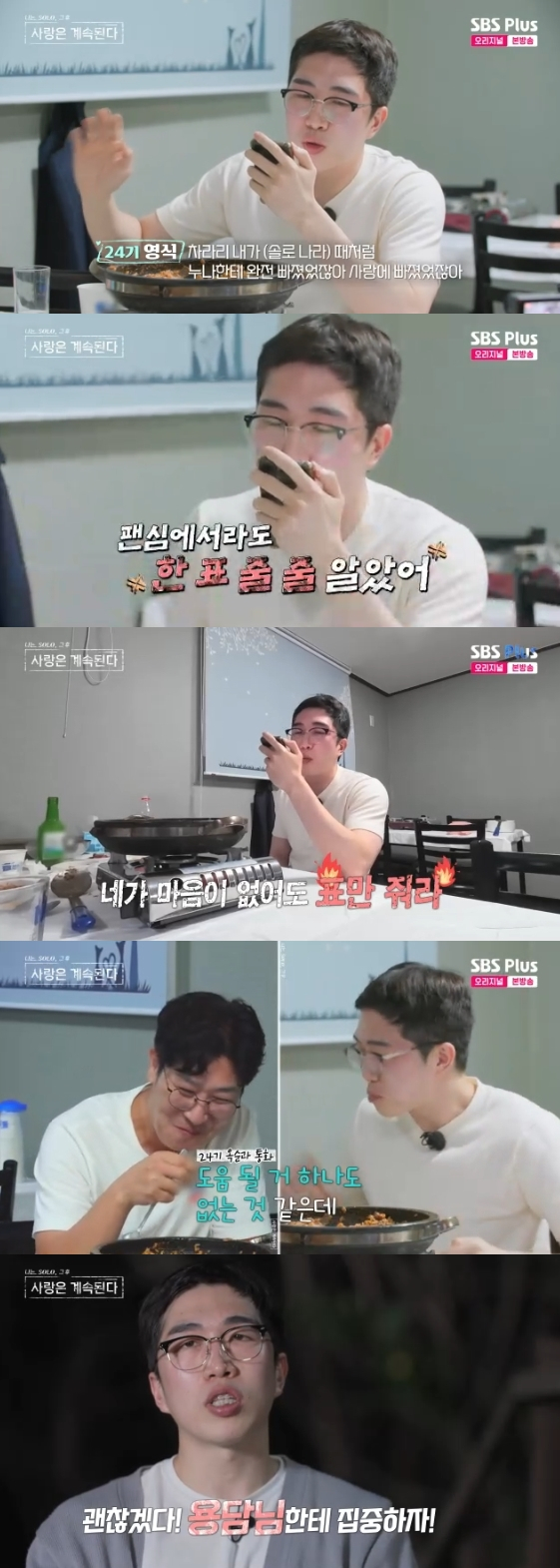 '나솔사계' 24기 영식이 데이트 0표의 굴욕을 맛본 뒤 24기 옥순에게 폭주했다. 20일 방송된 SBS Plus, ENA 예능 프로그램 '나는SOLO, 그 후 사랑은 계속된다'(이하 '나솔사계')에는 상심한 24기 영식을 위로하는 미스터 백김의 모습이 그려졌다.