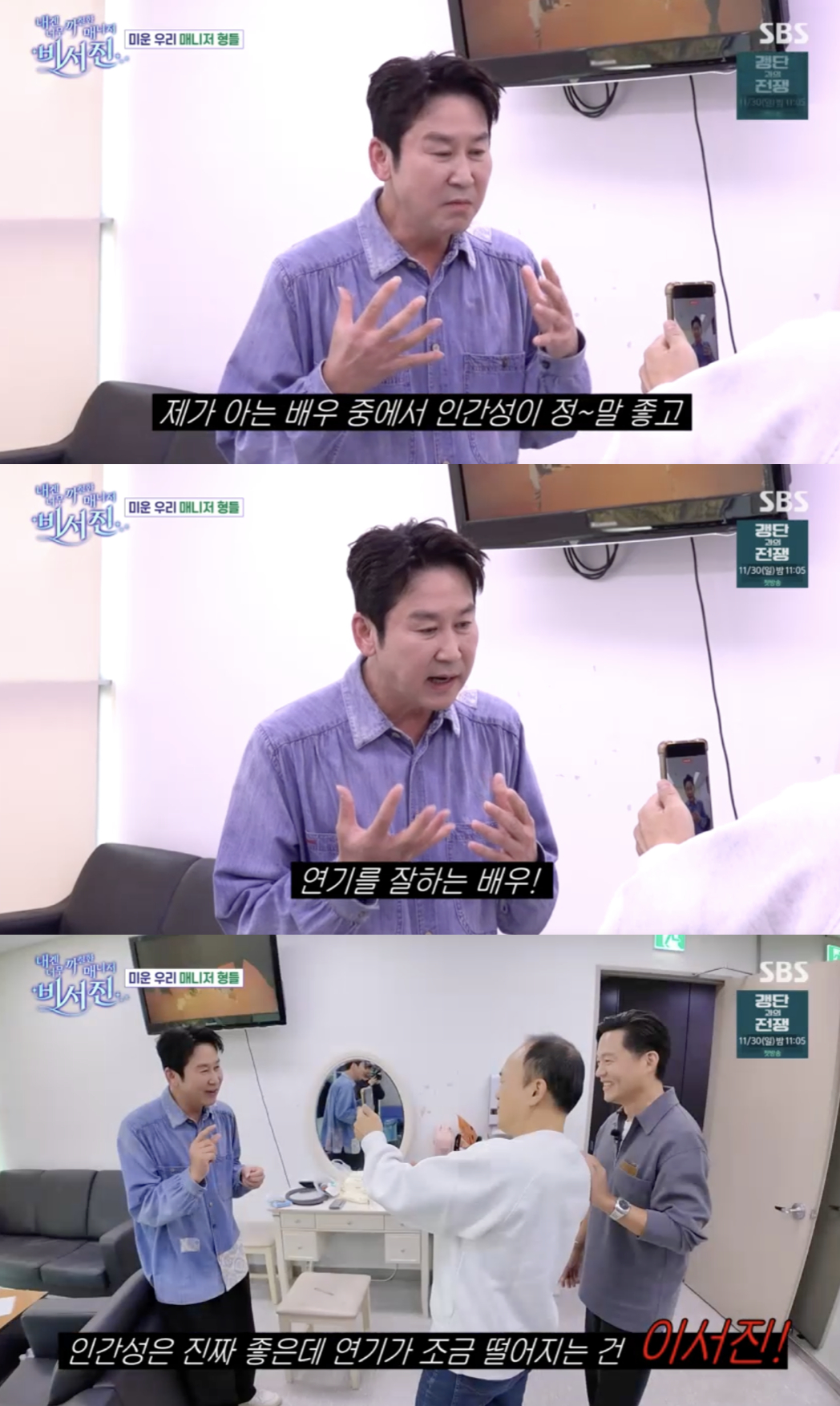 신동엽이 배우 이서진의 연기력에 대해 거침없는 팩트 폭격을 날렸다.21일 방송된 SBS 예능 프로그램 '내겐 너무 까칠한 매니저 - 비서진'(이하 '비서진')에서는 배우 조정석이 일곱 번째 'my 스타'로 등장해 이서진과 김광규의 수발을 받는 모습이 그려졌다.