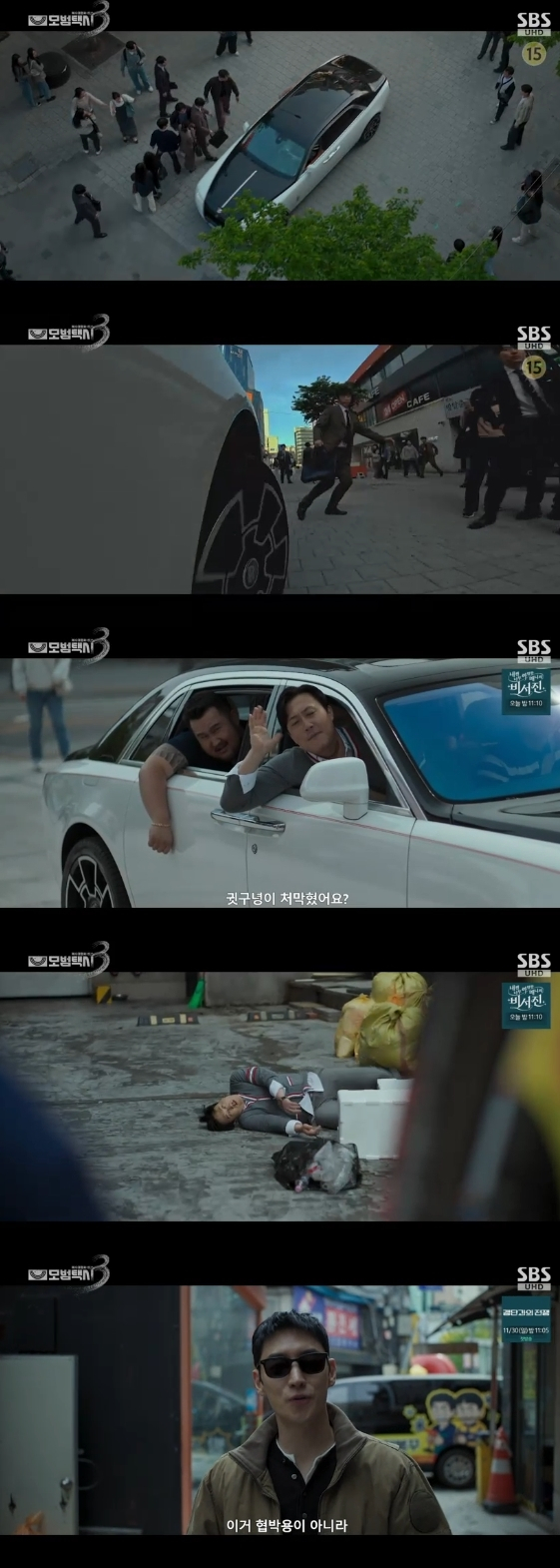 28일 방송된 SBS 금토 드라마 '모범택시 3'에는 중고차 빌런 차병진(윤시윤 분)을 상대하는 무지개운수 식수들의 모습이 그려졌다.