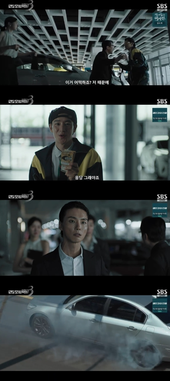 28일 방송된 SBS 금토 드라마 '모범택시 3'에는 중고차 빌런 차병진(윤시윤 분)을 상대하는 무지개운수 식수들의 모습이 그려졌다.