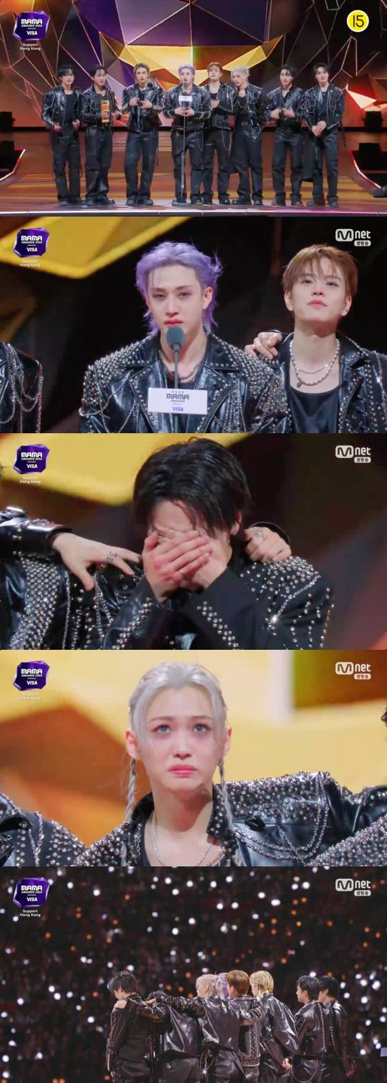 특히 승민은 "무엇보다도 우리의 원동력, 우리가 많은 힘을 얻는 스테이(팬덤명) 고맙다. 이 큰 상을 여러분에게도 선물하고 싶다. 지금까지 저희가 걸어온 길들이 쉽지만은 않았다. 그 안에서 정말 많은 갈림길이 있었다. 그 앞에서 저희가 무수히 많이 했던 선택들과 고민들이 있었기에 지금 여덟 명이 함께일 수 있는 것 같다"며 오열했다.승민은 또 "여덟 개 어깨에 우리의 꿈을 싣고 여기까지 올 수 있었던 건 다 멤버들 덕분"이라며 "있는 힘껏 응원해 주신 스테이 덕분이다. 며칠 전 이곳 홍콩에서 너무 가슴 아픈 일이 있었다. 희생자들과 피해자들에게 깊은 애도를 표한다. 저희 스트레이 키즈의 음악과 활동이 조금이나마 여러분에게 힘, 위로, 응원이 되기를 바란다. 앞으로도 그런 그룹이 되고 싶다. 팀명 스트레이 키즈 안에 담긴 의미처럼 저희도 매분매초 방황한다. 여러분과 똑같다. 저희 사랑해 주셔서 진심으로 감사하다"고 전했다.
