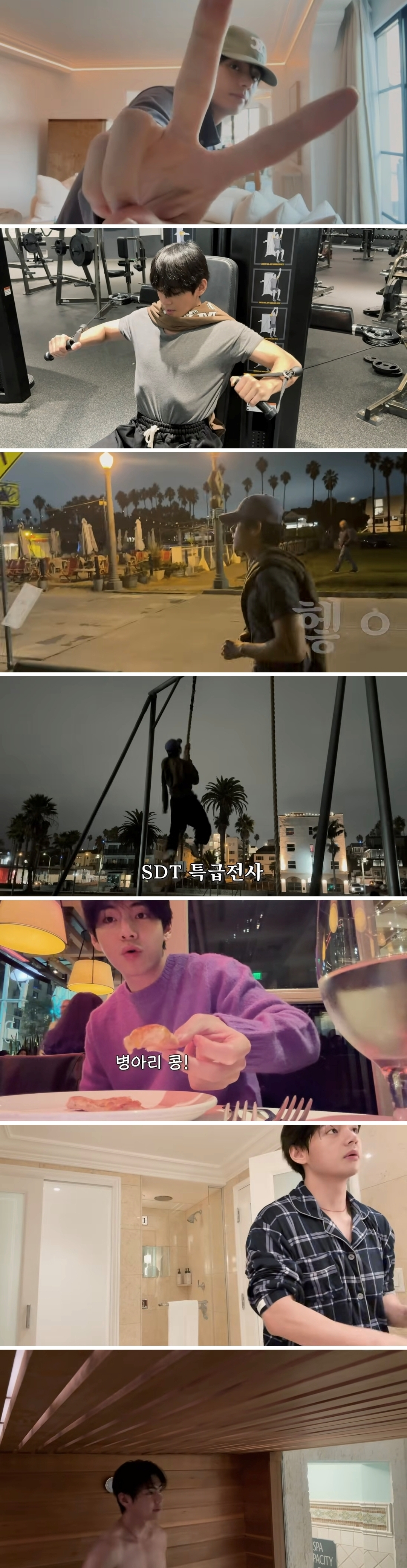 호텔에 도착한 뷔는 간단한 식사를 끝내자마자 바로 헬스장으로 달려가 운동을 시작했다. 헬스장에서 나와 다시 해변가에서 러닝을 하며 철저히 관리하는 모습으로 자기관리 끝판왕의 면모를 뽐냈다.달리던 도중 해변가에 설치된 외줄타기를 보고는 밧줄에 발을 걸지 않고 오로지 팔과 복근의 상체 힘으로만 외줄타기에 성공, SDT 특급전사 출신다운 강한 체력은 감탄을 자아내게 했다.