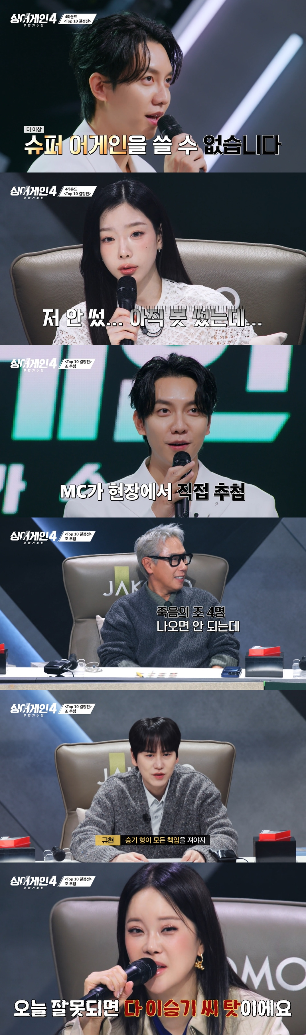 이날 이승기는 "TOP10 결정전부터는 더이상 슈퍼 어게인을 쓸 수 없다. 소멸이 된다"라고 밝혔다. 그러자 태연과 코드 쿤스트는 "나 아직 못 썼는데"라며 당황해했고, 김이나는 "아끼다 똥 됐다"라고 말했다.