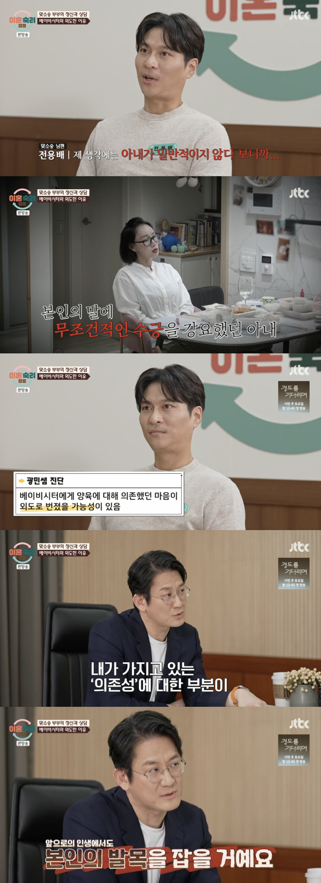 이에 전문의는 아내의 태도만의 문제가 아니라고 짚었다. 이광민 전문의는 아내가 자신의 말에 대해 "무조건적인 수긍을 강요했던 부분"에는 일정 부분 동의하면서도, 동시에 남편의 태도에도 문제가 있다고 지적했다. 그는 "그에 대한 남편의 수용적인 태도 때문에 (관계의) 문제가 커진 측면도 있다"고 말했다.이어 전문의는 "예전에 비해 의존성이 줄어든 것 같다. 남편이 철없는 아이에서 약간 철이 들었다"고 말했다. 다만 "그런데 제가 염려하는 건, 여전히 의존성이 남아 있다"고 우려를 드러냈다.