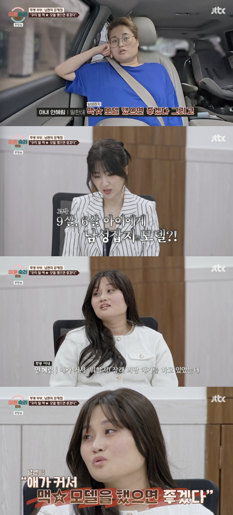 아내는 "첫째가 4살 때, 아이의 장래희망 이야기를 하다가 아빠가 딸에게 '커서 맥심 잡지 모델 했으면 좋겠다'라고 했다"고 설명했다. 남편은 "당시에는 장난 삼아서 얘기했다"고 주장했다.