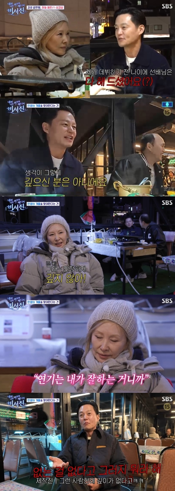 그런가 하면 이미숙은 전성기를 지나 내리막길을 걷고 있는데 대해 "힘들진 않았다. 주인공에서 물러난다고 해서 내가 없어지는 건 아니다. 어떤 역할을 하든 그 역할에 최선을 다하고 주인공처럼 하는 거다. 작은 역할이라고 헛되이 하지 않겠다고 생각한다"라고 연기 철학을 밝혔다. 그러자 김광규는 "그런 것에 스트레스를 안 받으시는 것 같다"라고 감탄했고, 이서진은 "내가 보니까 생각이 그렇게 깊으신 분이 아니다"라고 팩폭을 날려 현장을 초토화했다.