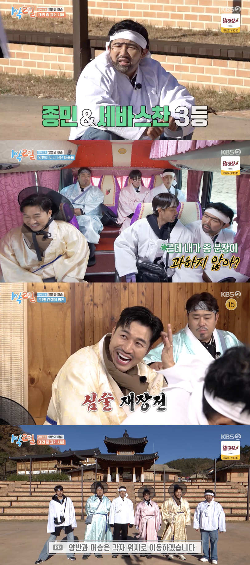 이어진 '대리 종 과거 시험' 게임에서는 김종민이 여유를 부리다 딘딘에게 정답을 빼앗기며 꼴지를 기록했다. 점심 식사는 보리밥과 고추장으로 정해졌고, 머슴들은 양반이 덜어주는 만큼만 먹을 수 있었다. 조세호는 "머슴도 같이 일하는 양반이 아쉬우면 힘들 것 같다"라고 아쉬움을 내비쳤다.이날 방송에서는 조세호와 문세윤이 촬영 하루 전 미리 안동에 내려와 '우정 여행'을 했다는 사실도 공개됐다.