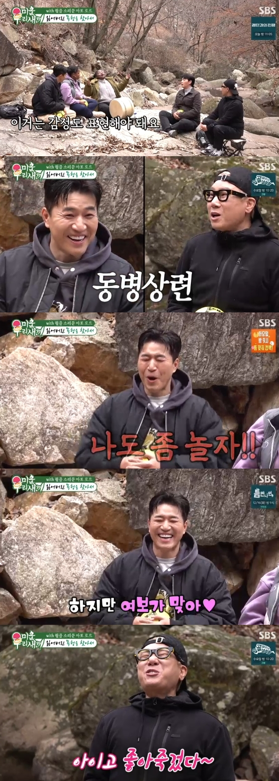 방송인 김종민이 아내에 대한 불만을 터뜨렸다. 7일 방송된 SBS 예능 프로그램 '미운 우리 새끼'(이하 '미우새')에는 프랑스 소리꾼 모포 로르를 만나러 산속으로 들어간 김종민, 이상민, 김승수의 모습이 그려졌다.
