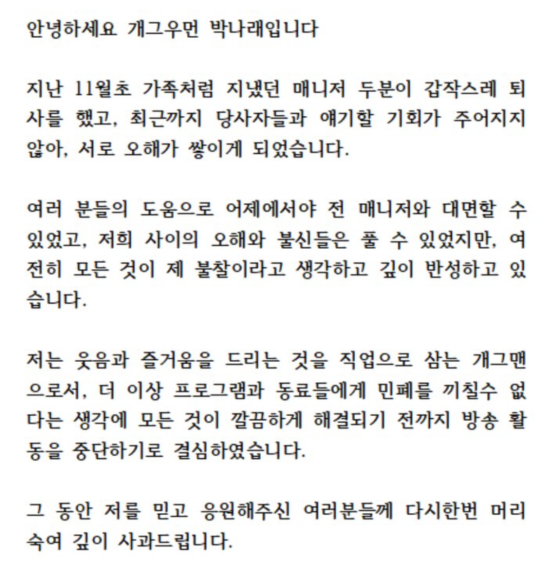 코미디언 박나래가 활동을 중단을 선언하고 사과했다.8일 박나래는 자신의 SNS를 통해 "지난 11월 초 가족처럼 지냈던 매니저 두 분이 갑작스레 퇴사했다"며 "어제야 전 매니저와 대면할 수 있었고, 저희 사이 오해와 불신들은 풀 수 있었지만 여전히 모든 것이 제 불찰이라고 생각하고 깊이 반성하고 있다"고 밝혔다.