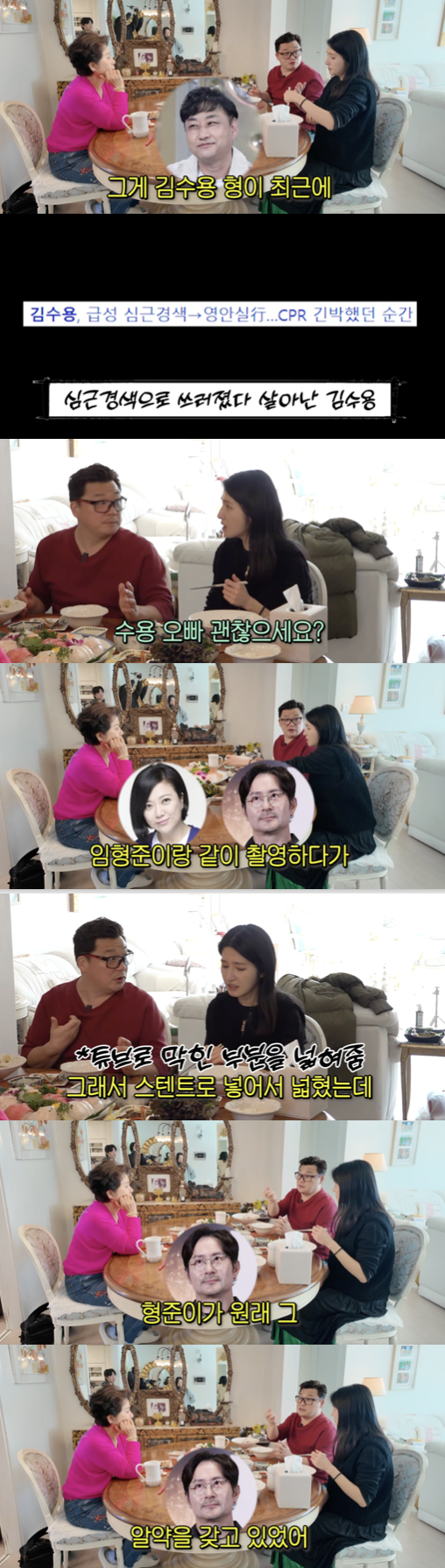 이후 윤정수는 최근 심근경색을 겪었던 김수용의 사례를 언급했다. 그는 "50대부터 운이 안 좋으면 누구나 건강을 한 방에 잃을 수 있다"며 "김수용 형이 최근에 그렇게 된 거 아니냐"고 말했다.윤정수는 당시 상황에 대해 "그게 김숙이랑 임형준이랑 같이 촬영하다가 심근경색이 온 거다. 스텐트 넣어서 넓혔다"며 "형준이가 심장약 알약을 갖고 있었고, 김숙한테 '약을 입에 넣어라'라고 해서 혀 밑에 넣고 녹게 했다. 형준이는 계속 심폐소생술을 했다고 하더라"고 전했다.