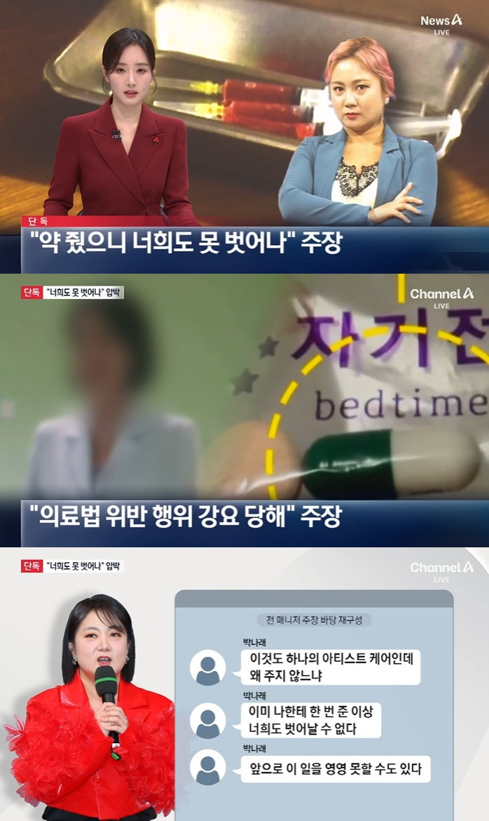 12일 방송된 채널A 뉴스에서는 박나래가 의료법 위반 가능성이 있는 행위를 매니저에게 강요했다는 내용을 전했다.
