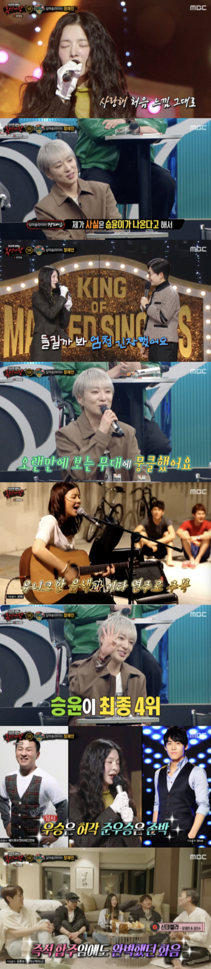 싱어송라이터 장재인과 강승윤이 재회했다.14일 방송된 MBC 예능 프로그램 '복면가왕'에서는 '러너'와 '러닝머신'이 1라운드에서 조정현의 '그 아픔까지 사랑한 거야'를 듀엣곡으로 선곡해 감성적인 무대를 선보였다.