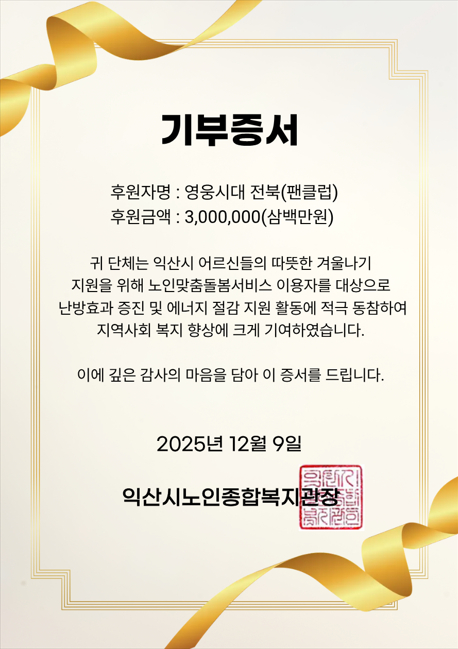 이번 기부금은 노인맞춤돌봄서비스를 이용하는 어르신 중 경제적으로 어려움을 겪는 어르신과 취약계층 가구에 겨울용 경량 이불 세트로 전달될 예정이다. 이를 통해 올겨울 따뜻한 보온과 정서적 안정이 제공될 것으로 기대된다.영웅시대 전북방은 평소에도 지역사회 나눔 활동에 적극 참여해왔다. 특히 지난 2023년 12월에도 익산시 노인종합복지관에 500만 원을 기부해 난방 취약계층을 위한 겨울 물품 지원에 힘을 보탰다.
