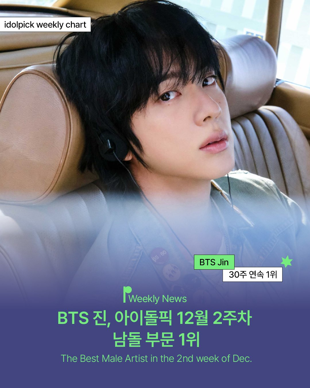 진은 12월 2주차(12월 8일~14일) 아이돌픽 위클리 투표에서 6만 2638픽을 획득해 남자 아이돌 개인 부문 1위를 차지했다. 해당 주차 전체 최다 득표를 기록하며 30주 연속 1위라는 기록을 이어갔다.
