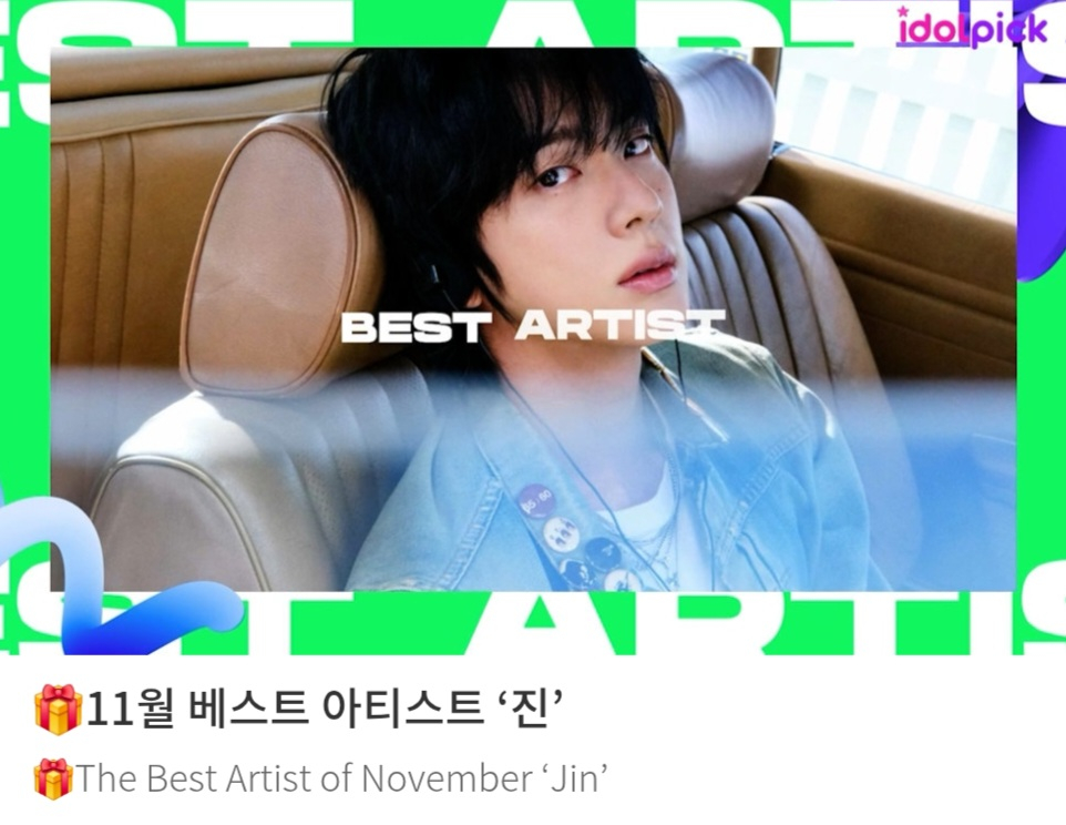 방탄소년단(BTS) 진이 아이돌픽(idolpick)에서 주간과 월간 투표 모두 정상에 오르며 인기를 빛냈다.